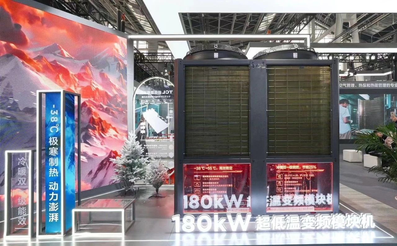 展會現(xiàn)場,TCL攜空氣能熱泵全產(chǎn)品矩陣亮相,設(shè)有TCL金剛王系列·180kW超低溫變頻模塊機、節(jié)能王系列·雙一級變頻增焓采暖機、巨熱王系列·全直流變頻采暖機,以及戶式采暖機、空氣能熱泵熱風(fēng)機等多個明星產(chǎn)品等在內(nèi)的七大產(chǎn)品體驗區(qū),一同展出的還有TMV6+全直流變頻中央空調(diào)。
