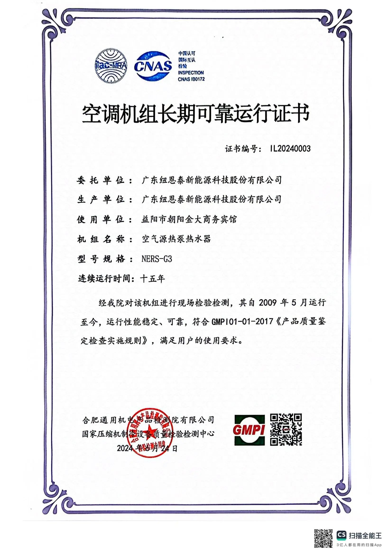 15年穩(wěn)定運(yùn)行!紐恩泰空氣能熱水機(jī)組可靠性獲權(quán)威認(rèn)證,刷新行業(yè)記錄