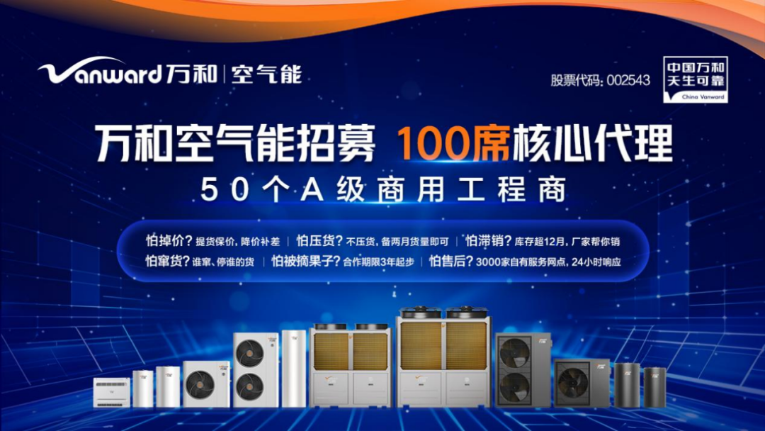 萬(wàn)和空氣能全國(guó)招商火熱進(jìn)行中!少量空白市場(chǎng),機(jī)遇難得!誠(chéng)招100個(gè)核心代理商+50個(gè)A級(jí)商用工程代理商加入萬(wàn)和陣營(yíng)!攜手熱泵領(lǐng)先品牌,搶占低碳財(cái)富先機(jī),共贏綠色未來(lái)!