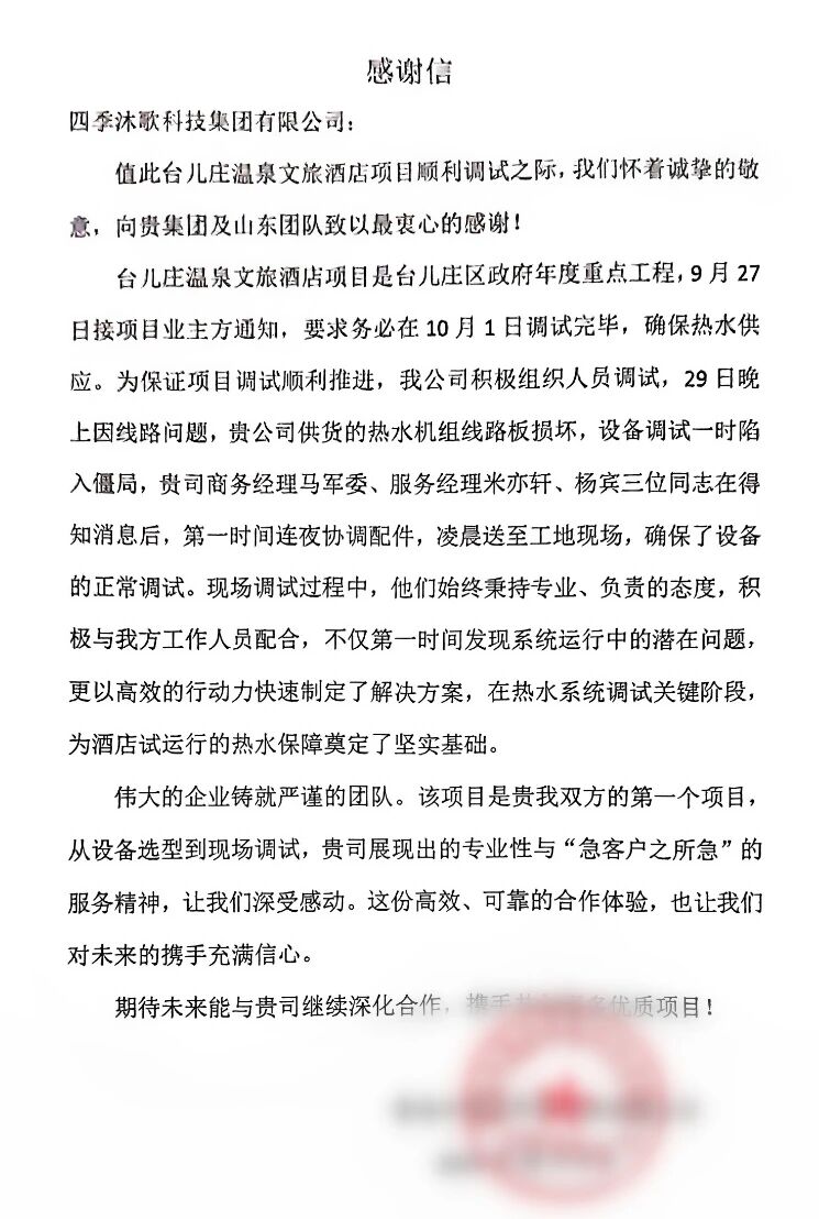 為趕工十一黃金假期的關鍵時間點,9月底臺兒莊溫泉文旅酒店熱水項目現(xiàn)場,當?shù)毓こ谭展菊影嗉狱c進行設備的安裝、調試工作,但由于線路操作不當,導致四季沐歌部分熱泵熱水機設備無法正常啟動,調試工作陷入停頓。頂著工期迫近的巨大壓力,工程服務公司負責人深夜撥打了四季沐歌山東濟南營銷中心團隊對接人的電話,了解清楚原委后,四季沐歌服務團隊立即往項目現(xiàn)場進行處理,協(xié)助工程服務公司提前完成項目熱水的調試工作,并給予標準化操作的建議、幫助排除系統(tǒng)運行的潛在問題。通過此次事件,四季沐歌專業(yè)化服務給工程公司留下了深刻印象,奠定下工程公司與四季沐歌長期合作的信心。