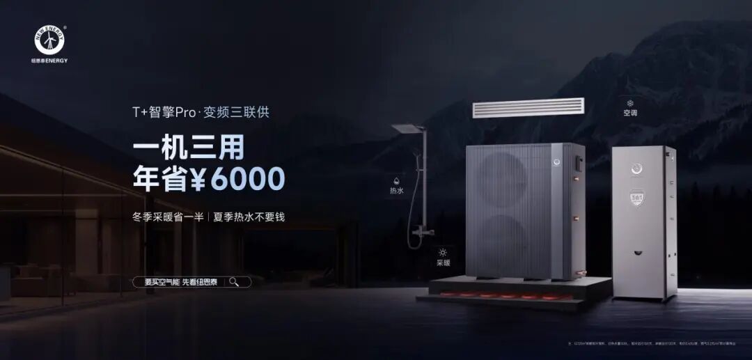 還有一種是“三聯(lián)供”,也就是提供采暖、制冷、生活熱水三種功能的系統(tǒng)。目前這類產(chǎn)品相對不多,比如紐恩泰空氣能的三聯(lián)供產(chǎn)品T+智擎Pro就是其中之一,冷暖雙強,夏季熱水免費用,搭配四個一級能效,一年能省6000元。