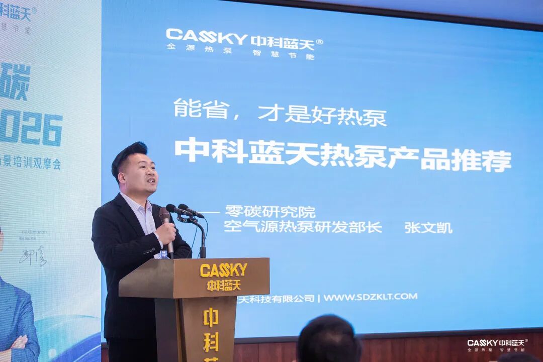 中科藍天集團零碳研究院副院長、空氣能研發(fā)部部長張文凱重點介紹了家家省系列、天天省系列、藍焰系列、第六代超靜音全直流變頻商用機組等產(chǎn)品。其中家家省二代低溫全變頻家用冷暖空氣源熱泵為新國標而生,APF遠超國家一級能效;天天省光伏直驅熱泵覆蓋5-180匹,應用領域更廣泛,天天用、天天?。凰{焰商用變頻機組有著在極寒高濕區(qū)域穩(wěn)定運行3年的表現(xiàn),更節(jié)能、更高效、更可靠;第六代超靜音全直流變頻商用機組,實現(xiàn)了綜合噪音更低、運行費用更低、占地空間更小三大核心突破,重新定義商用供暖標準。