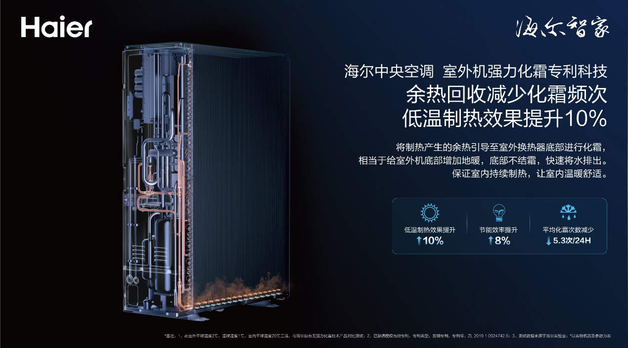 出色制熱表現的背后是硬核科技的支撐!全新一代海爾中央空調御家Ⅱ搭載強力化霜科技,通過改變外機底部流路設計、回收冷媒余熱,相當于給外機增加了一個“地暖”。相比普通空調,外機底部不結霜,同時低溫制熱效果提升10%,保證室內溫暖如春。