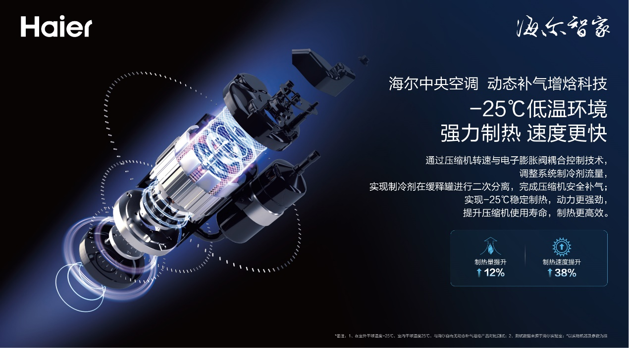 全新一代海爾中央空調御家Ⅱ原創(chuàng)動態(tài)補氣增焓科技,采用大壓比壓縮機,動力更強勁,制熱更高效。相比普通空調,低溫制熱速度提高38%,制熱量提升12%,即使在-25℃超低溫環(huán)境下也能強勁制熱。
