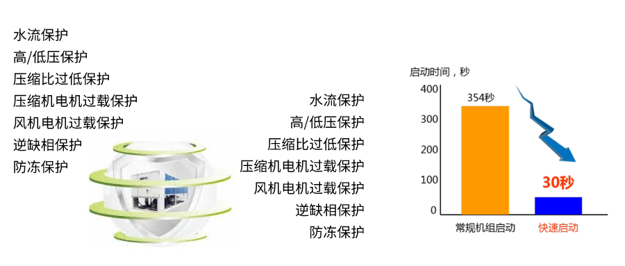 系統(tǒng)具有多重保護措施以及自診斷和故障報警功能,及時發(fā)現(xiàn)并解決系統(tǒng)故障以確保系統(tǒng)安全運行。如故障備運轉、過載保護、缺相保護、高/低壓保護、防凍保護等二十多項保護功能。此外,機組可以在恢復通電后30秒內重啟壓縮機,在最短的時間內恢復至斷電前的運行狀態(tài),保障用戶使用體驗,進一步提高系統(tǒng)的可靠性和穩(wěn)定性。