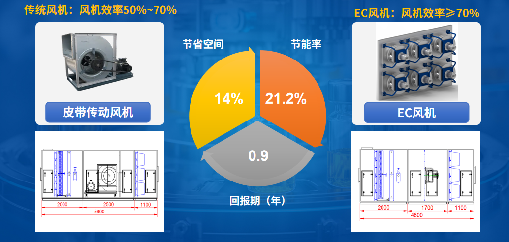 EK工業(yè)空調(diào)發(fā)起EC變頻普及風(fēng)暴,用“EC風(fēng)墻”技術(shù)提升風(fēng)機(jī)運(yùn)行效率和備用安全,對(duì)比傳統(tǒng)風(fēng)機(jī)節(jié)能率高達(dá)21.2%,同時(shí)節(jié)省空間14%。