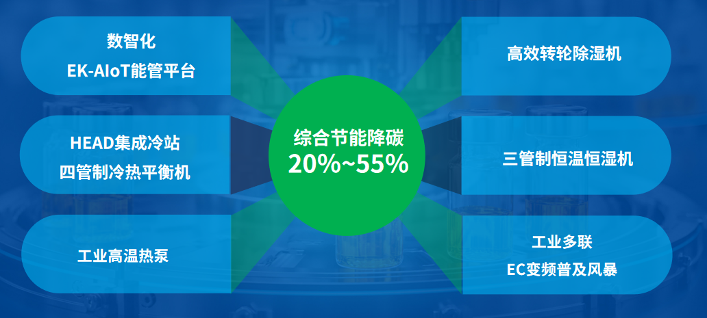 針對(duì)制藥行業(yè)能耗和運(yùn)維困局,EK工業(yè)空調(diào)提出完整的制藥廠房節(jié)能降碳路線,系統(tǒng)推進(jìn)潔凈、冷源、熱源、干燥及運(yùn)維五大需求向EC、高效、低碳、節(jié)能和數(shù)智化運(yùn)維方向發(fā)展。