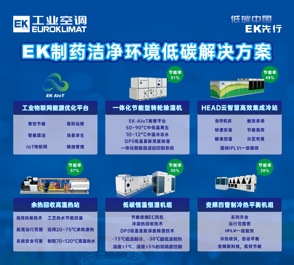 作為制藥行業(yè)的空氣處理專家,EK工業(yè)空調(diào)始終聚焦行業(yè)實際需求,打造覆蓋工業(yè)冷熱源、工業(yè)高溫?zé)岜?、工業(yè)環(huán)境控制及工業(yè)氟系統(tǒng)等多領(lǐng)域的節(jié)能產(chǎn)品矩陣,包括HEAD高效集成冷站、四管制冷熱平衡機、60~80℃中溫?zé)岜脵C組、80~120℃高溫?zé)岜脵C組、三管制恒溫恒濕機、一體化高效轉(zhuǎn)輪除濕機、EC風(fēng)機墻、工業(yè)多聯(lián)系列等綠色產(chǎn)品與系統(tǒng)方案。同時,依托EK工業(yè)空調(diào)自主研發(fā)的EK-AIoT工業(yè)物聯(lián)網(wǎng)能源優(yōu)化平臺,實現(xiàn)對設(shè)備狀態(tài)的智能監(jiān)控與云端運維,為制藥企業(yè)提供高效、低碳、可靠的溫環(huán)境系統(tǒng)解決方案,切實幫助藥企實現(xiàn)節(jié)能降耗與綠色運營。