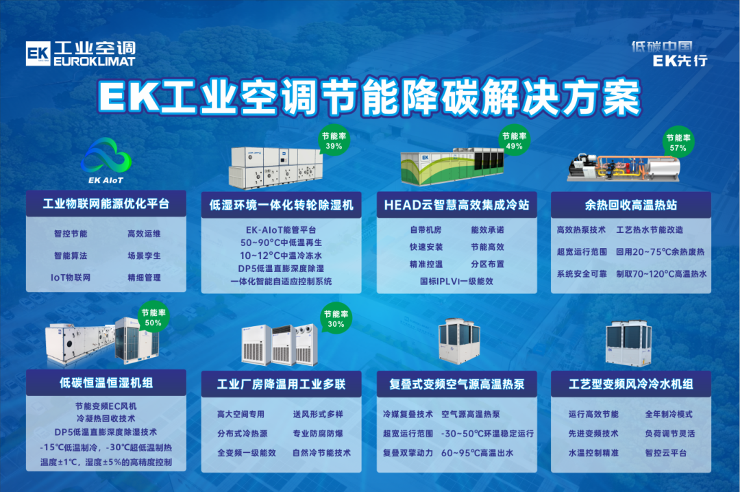 低碳中國,EK先行!自1963年成立至今,EK工業(yè)空調(diào)始終秉承以技術(shù)創(chuàng)新為動力、以節(jié)能環(huán)保為導(dǎo)向的理念,致力于成為節(jié)能低碳能源系統(tǒng)專家。基于“節(jié)能&低碳”“工程產(chǎn)品化”“數(shù)智化運維”三大核心戰(zhàn)略,EK工業(yè)空調(diào)為零碳工廠建設(shè)提供全方位的暖通空調(diào)解決方案。針對行業(yè)痛點,EK工業(yè)空調(diào)打造覆蓋工業(yè)冷熱源、工業(yè)高溫?zé)岜谩⒐I(yè)環(huán)境控制及工業(yè)氟系統(tǒng)等多領(lǐng)域的節(jié)能產(chǎn)品矩陣,可提供EK-AIoT工業(yè)物聯(lián)網(wǎng)能源優(yōu)化平臺、HEAD云智慧高效集成冷站、HP120工業(yè)高溫?zé)岜?、DP5一體化高效轉(zhuǎn)輪除濕機、工業(yè)多聯(lián)等專業(yè)、高效、智能的低碳解決方案,全方位滿足客戶的多樣化需求。