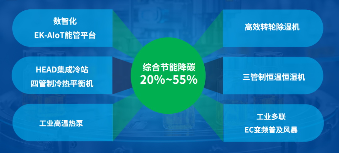低碳熱源節(jié)能降碳路線與冷源、干燥、潔凈等節(jié)能降碳路線,依托數(shù)智化運(yùn)維管理,共同構(gòu)成EK制藥廠房節(jié)能降碳解決方案。通過(guò)多技術(shù)路徑協(xié)同,為制藥企業(yè)提供20%~55%的綜合節(jié)能降碳效益,助力企業(yè)在能效提升與綠色發(fā)展方面實(shí)現(xiàn)雙重突破。