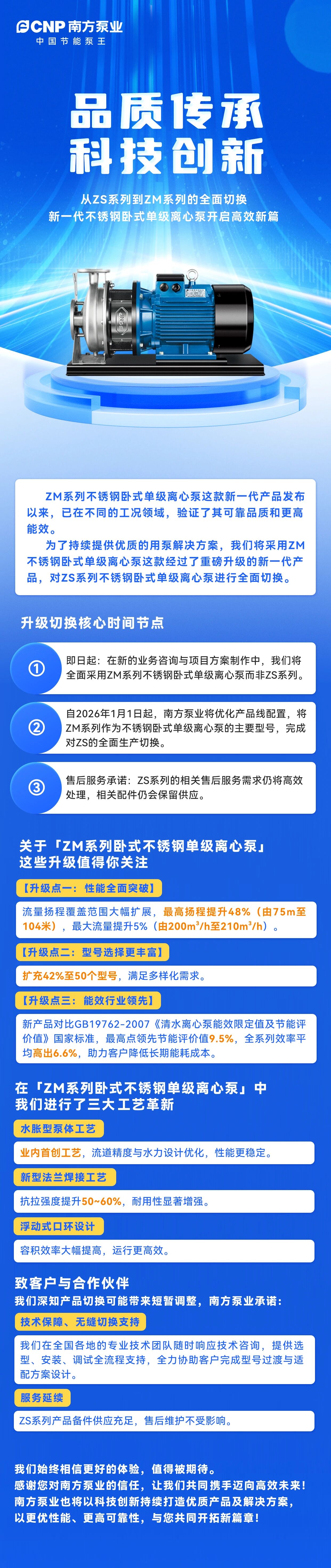 品質(zhì)傳承 科技創(chuàng)新丨從ZS系列到ZM系列的全面切換,新一代不銹鋼臥式單級離心泵開啟高效新篇?