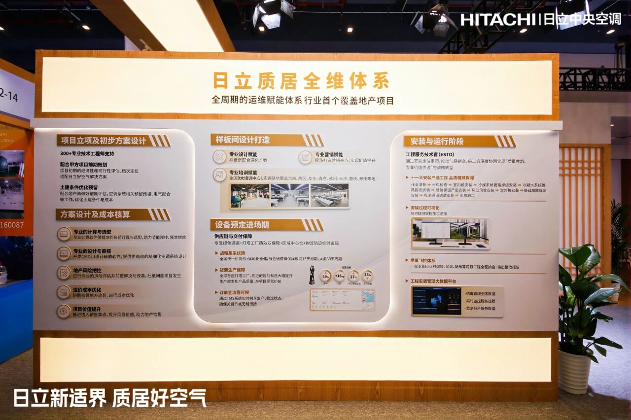 本屆展會,“日立質(zhì)居全維體系”同時重磅發(fā)布。作為行業(yè)首個覆蓋地產(chǎn)項(xiàng)目全生命周期的運(yùn)維賦能系統(tǒng),該體系致力于從前端設(shè)計(jì)、中期施工到后期運(yùn)維,為項(xiàng)目提供全鏈路、系統(tǒng)化的品質(zhì)保障,真正實(shí)現(xiàn)從提供產(chǎn)品設(shè)備到全周期價(jià)值的服務(wù)升級。