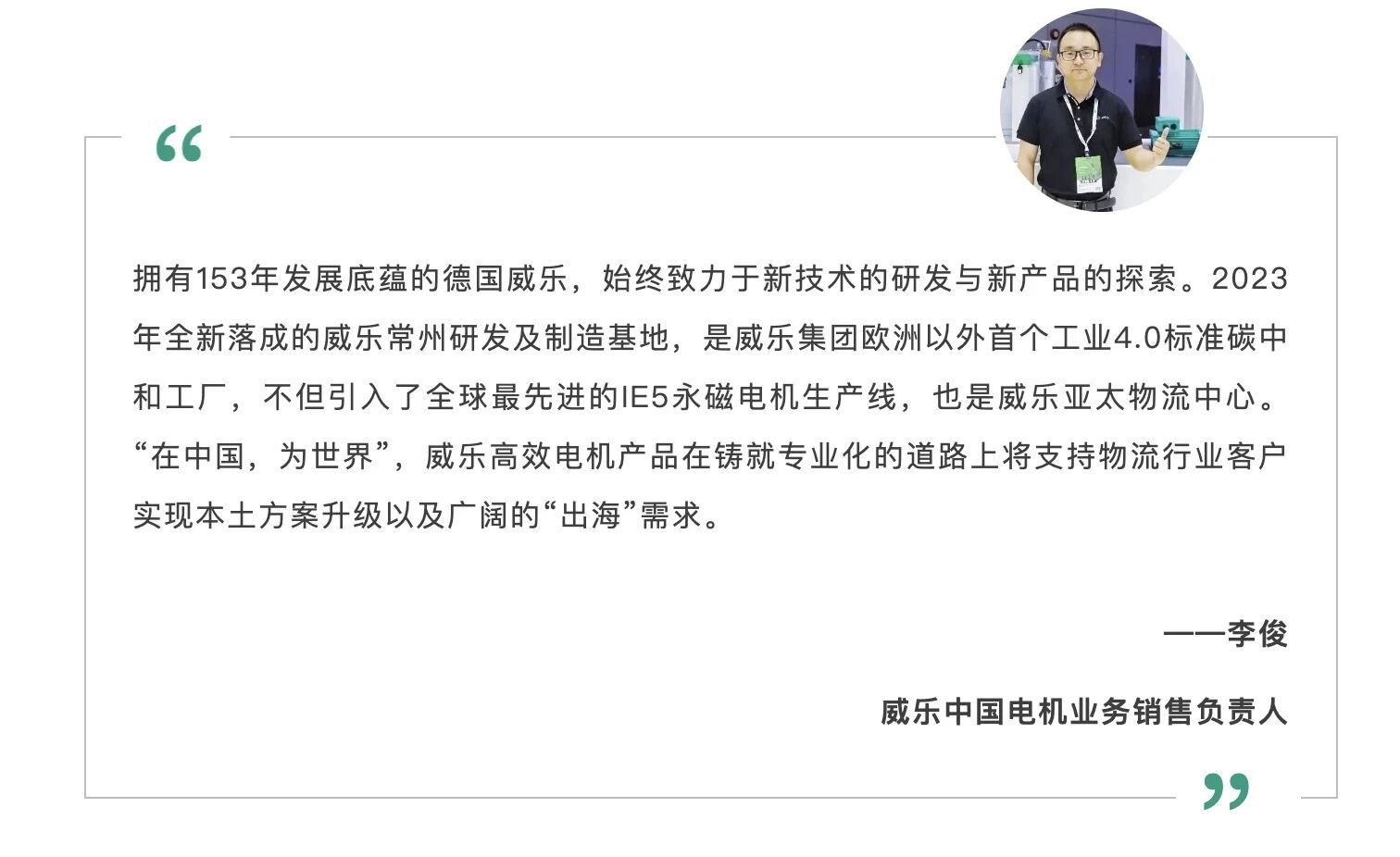 展會期間,「新華社- 智能·零碳」赴威樂展臺,對威樂中國電機(jī)業(yè)務(wù)銷售負(fù)責(zé)人李俊進(jìn)行訪談。