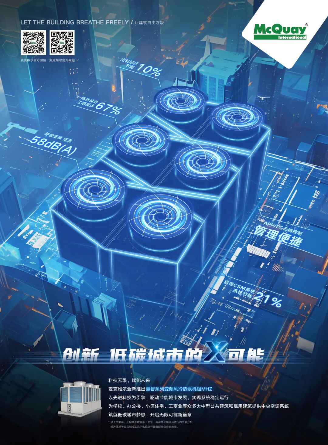 面對這些嚴(yán)苛且綜合的需求,傳統(tǒng)的空調(diào)方案往往顧此失彼。而麥克維爾MHZ慧智系列變頻風(fēng)冷熱泵機(jī)組,以其一體化、全變頻、智能化的基因,成為了破題的關(guān)鍵。