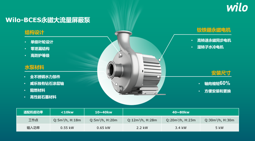 Wilo-BCES系列大流量永磁屏蔽泵產(chǎn)品,是專門面向嚴苛使用環(huán)境、高防護要求、高可靠性要求的儲能溫控配套定制水泵市場,針對非常有限的安裝空間、設(shè)備泄漏風險、設(shè)備運行噪音高以及設(shè)備位置偏遠為維修帶來極大不便利性等行業(yè)痛點,Wilo-BCES系列產(chǎn)品極其緊湊的產(chǎn)品結(jié)構(gòu)、零泄漏的運行保障、水冷電機的有效降低噪音以及IP68的超高防護等級,都將為儲能溫控行業(yè)設(shè)備商及終端用戶帶來更加安心的使用體驗、更好的運行保障,以及更多的成本節(jié)約和對周邊環(huán)境及人文安全的維護。