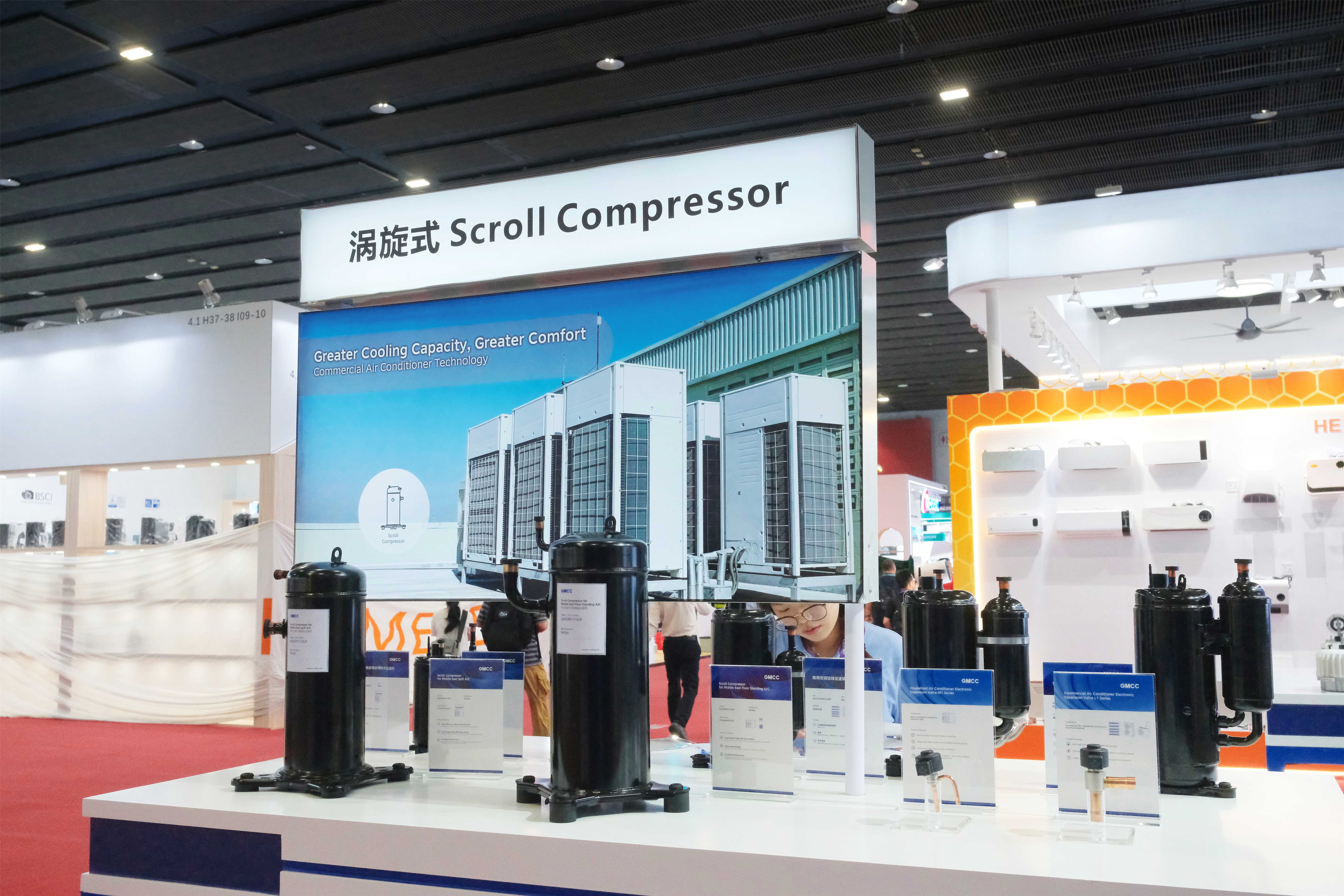 除家用空調(diào)外,美芝現(xiàn)場還展示了應(yīng)用于T3工況(適用于最高環(huán)境溫度?52°C?的熱帶氣候)的家用及商用領(lǐng)域的轉(zhuǎn)子式壓縮機、渦旋式壓縮機等產(chǎn)品。如針對中東等高溫干燥地區(qū)的嚴苛運行環(huán)境,美芝針對性推出中東分體空調(diào)渦旋壓縮機。在高溫環(huán)境下,該壓縮機制冷能力顯著優(yōu)于常規(guī)活塞機型,能效比高出6%~8%,保障用戶在酷熱季節(jié)的擁有舒適體驗。