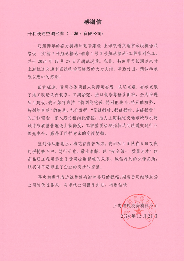 近日,東芝空調(diào)榮幸地收到了來自上海申鐵投資有限公司(簡稱“上海申鐵”)的一封感謝信。