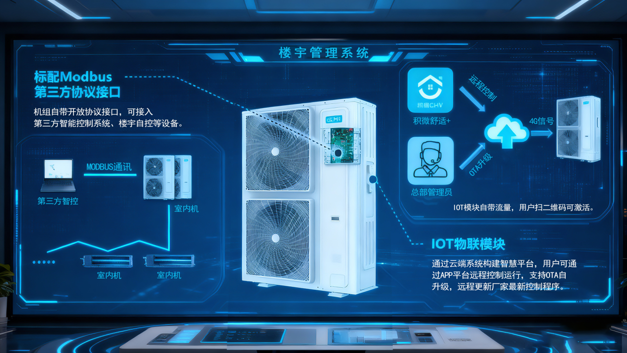 M系列智慧多聯(lián)機(jī)標(biāo)配Modbus樓宇接口和物聯(lián)模塊,無論商場是沿用舊集控系統(tǒng)還是新增樓宇管理系統(tǒng),都能兼容對接,實現(xiàn)空調(diào)的統(tǒng)一管控。