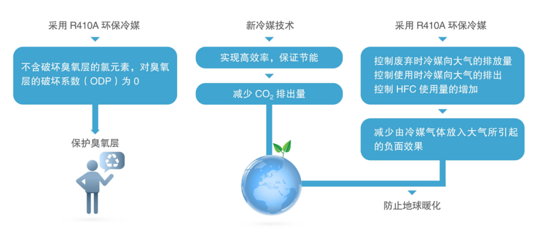 采用新型環(huán)保制冷劑R410A,制冷效率更高。另外,R410A環(huán)保冷媒不含破壞臭氧層的氯元素,對(duì)臭氧層的破壞系數(shù)(ODP)為0,并且還可以有效減少CO2的排放。