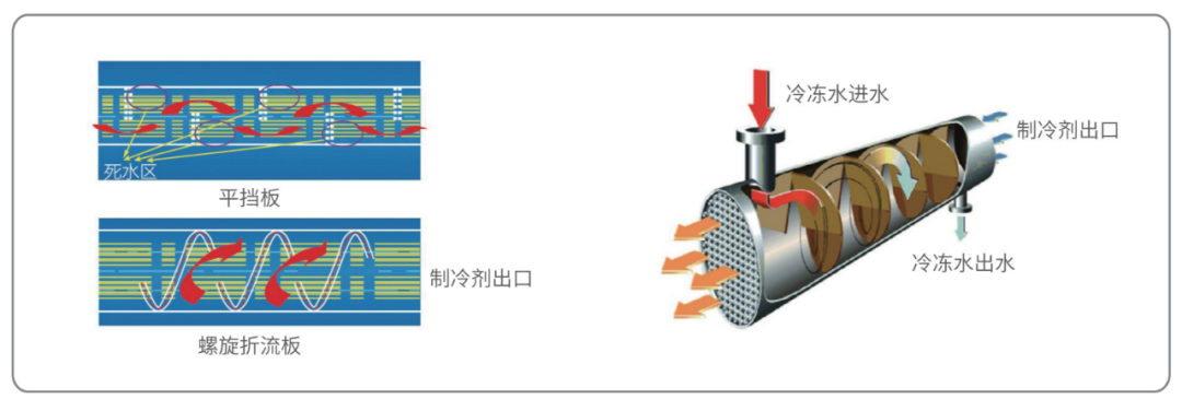 對(duì)于管殼式換熱器,該模塊機(jī)采用了新型螺旋折流板設(shè)計(jì),避免死水區(qū)形成矩形空間,大大提高換熱效率。