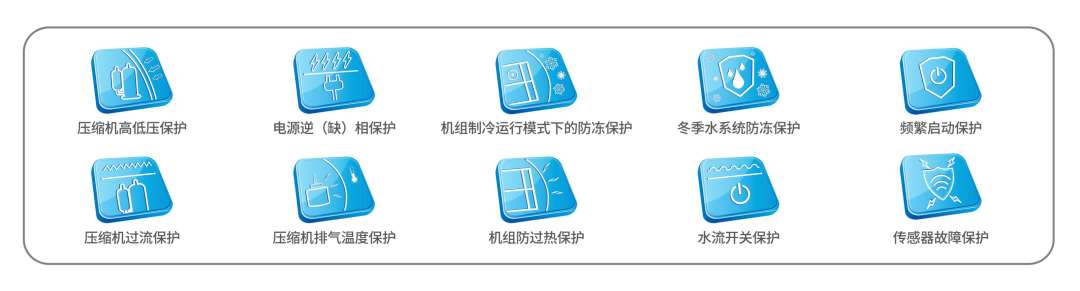 采用模塊化結(jié)構(gòu),機(jī)組分級(jí)啟動(dòng),減少機(jī)組啟動(dòng)電流對(duì)電網(wǎng)的沖擊,機(jī)組自帶高低壓開(kāi)關(guān)、防凍保護(hù)裝置、流量控制器、過(guò)載保護(hù)裝置、電源相序保護(hù)裝置等,并配有運(yùn)行控制裝置,出現(xiàn)故障時(shí),控制器進(jìn)行實(shí)時(shí)自動(dòng)報(bào)警。