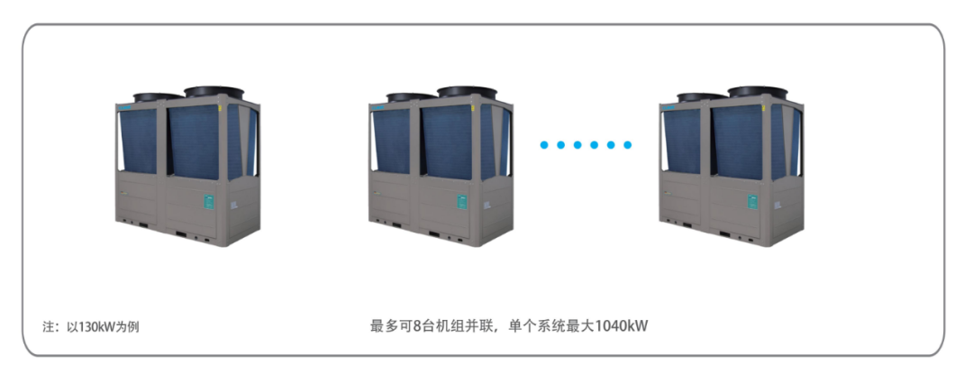 不同容量規(guī)格的單元模塊可自由組合,最大可實(shí)行8臺(tái)并聯(lián),兼容性擴(kuò)展性強(qiáng),用戶根據(jù)安裝現(xiàn)場(chǎng)的場(chǎng)地特點(diǎn),可以選擇多種組合連接方式,實(shí)現(xiàn)1~8臺(tái)模塊并聯(lián)使用,最大冷量高達(dá)1040KW,充分滿足不同需求。同一系統(tǒng)的風(fēng)冷模塊機(jī)組分級(jí)啟動(dòng),均衡運(yùn)轉(zhuǎn),減少機(jī)組啟動(dòng)電流對(duì)電網(wǎng)的沖擊。