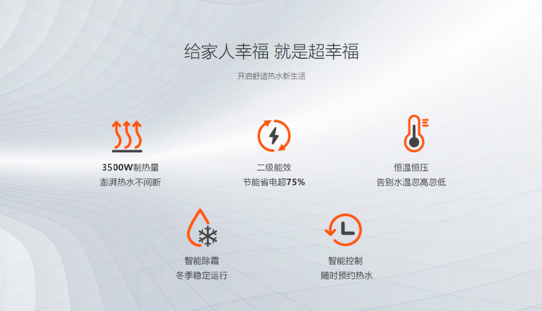 節(jié)能舒適性價(jià)比高。超幸福系列水箱的蓄水容量為150L~200L,制熱量達(dá)3500W,既能保證充足的熱水供應(yīng)量,又能長時(shí)間保證水溫恒定。該系列采用了先進(jìn)的空氣源熱泵技術(shù),COP可達(dá)4.1以上,達(dá)國家二級(jí)能效標(biāo)準(zhǔn),節(jié)能效果顯著,比傳統(tǒng)電熱水器省電超75%。