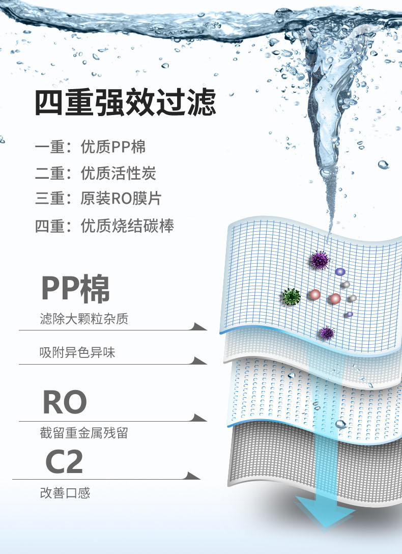 采用優(yōu)質(zhì)PP棉、燒結(jié)碳棒和原裝RO膜濾芯