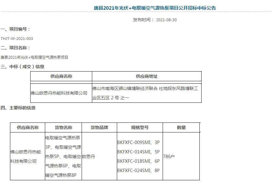 近日,中國河北政府采購網(wǎng)公示唐縣2021年光伏+電取暖空氣源熱泵項目公開招標項目公告招標結(jié)果,佛山歐思丹熱能科技有限公司等實力企業(yè),成功中標!