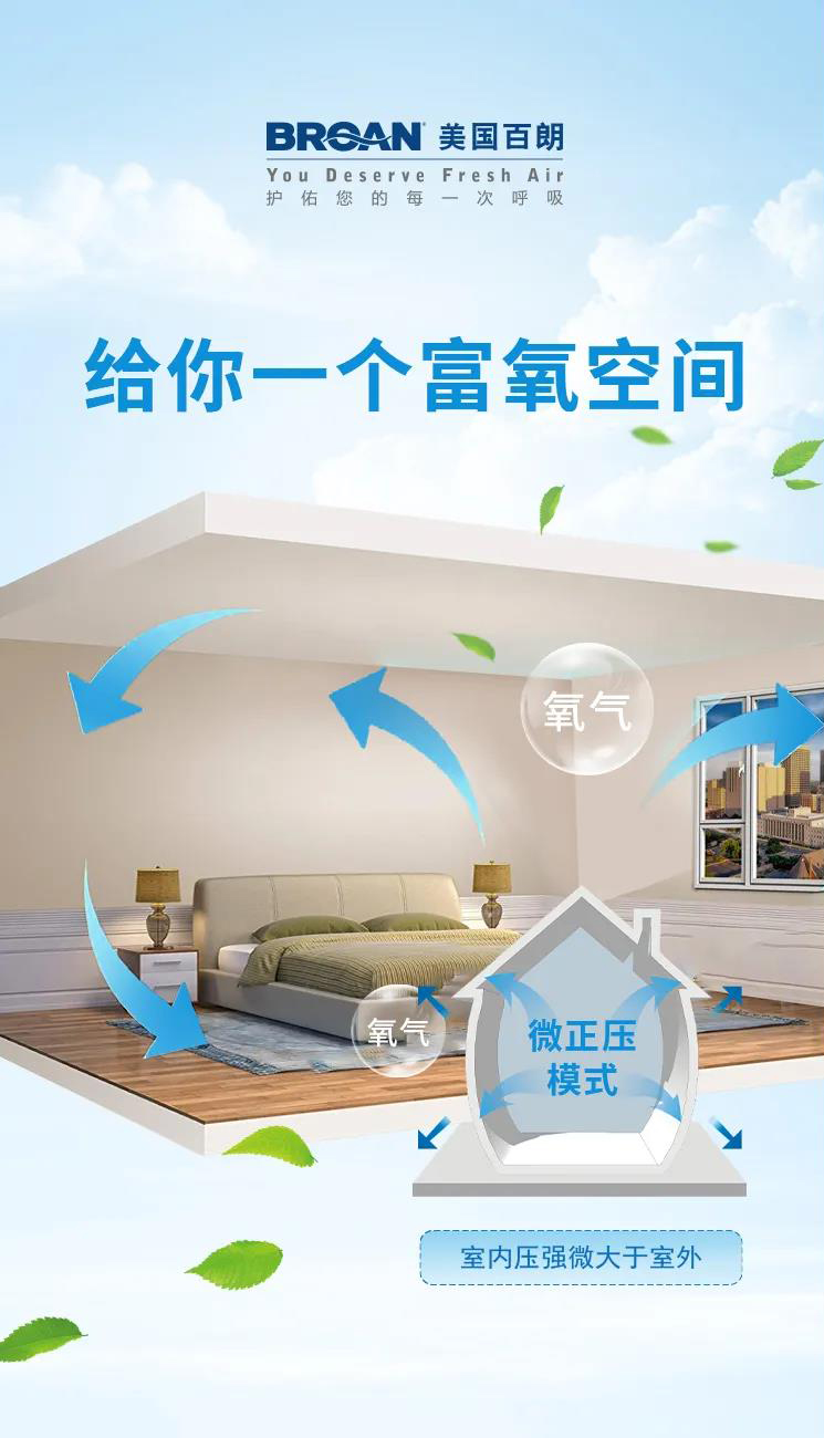 BROAN SOLO新風(fēng)系統(tǒng)采用微正壓送風(fēng)技術(shù),可以減少氣流倒灌可能對室內(nèi)空氣質(zhì)量造成的影響,24H置換新鮮空氣,提升密閉空間內(nèi)的含氧量,睡眠時也要呼吸滿滿的富氧空氣。