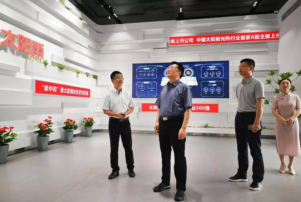 在徐董事長(zhǎng)的陪同下,劉局長(zhǎng)一行參觀(guān)了太陽(yáng)雨品牌展廳和清潔熱能智慧體驗(yàn)館,詳細(xì)了解了太陽(yáng)雨集團(tuán)的發(fā)展歷程,發(fā)展戰(zhàn)略和主營(yíng)業(yè)務(wù),表達(dá)了對(duì)家鄉(xiāng)清潔能源企業(yè)的殷殷關(guān)切。