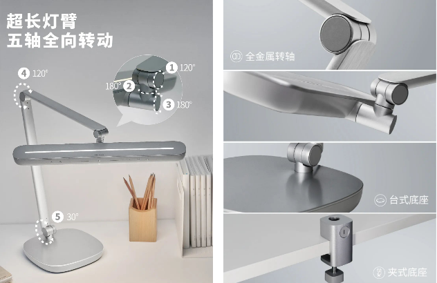 ●五軸全景燈頭和可靈活轉(zhuǎn)動的金屬長燈臂,可根據(jù)孩子的身高自由調(diào)控?zé)纛^高度及方向;