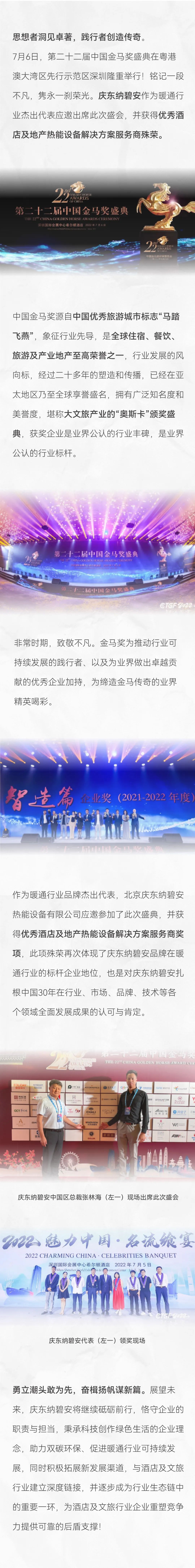 慶東納碧安獲得第二十二屆中國(guó)金馬獎(jiǎng)優(yōu)秀酒店及地產(chǎn)熱能設(shè)備解決方案服務(wù)商殊榮
