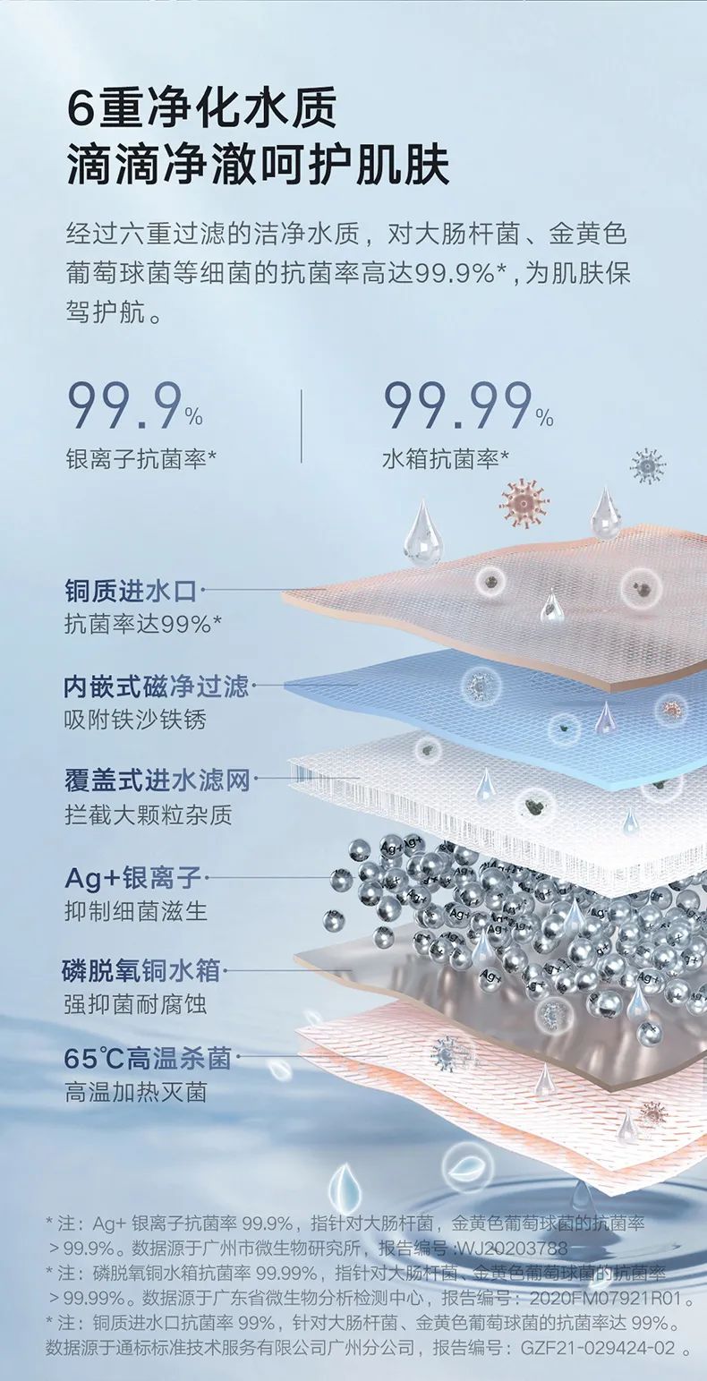 一般家中熱水器都是直接接入自來水,即使經(jīng)過凈化水中仍然存在易引起皮膚過敏的雜質(zhì),想要擁有潔凈的沐浴體驗(yàn),還需要關(guān)注水的源頭治理。云米Super 2 Max創(chuàng)新加入6重凈化水質(zhì)功能,通過內(nèi)部的Ag+銀離子、磷脫氧銅水箱、銅制進(jìn)水口、內(nèi)嵌式磁凈過濾、覆蓋式進(jìn)水濾網(wǎng)和65℃高溫殺菌6重過濾,實(shí)現(xiàn)對(duì)自來水的深度凈化,可以有效抑制大腸桿菌、金黃色葡萄球菌等細(xì)菌,抗菌率高達(dá)99.99%,為皮膚保駕護(hù)航,尤其對(duì)于家中有寶寶的家庭,必是首選。