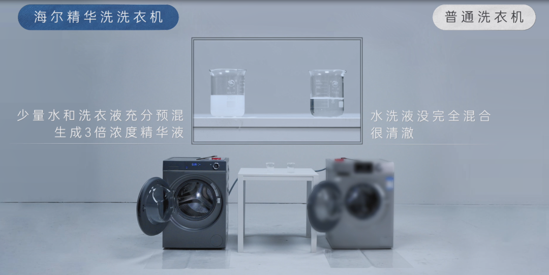 海爾“精華洗”洗衣機速溶預(yù)混3倍濃度“精華液”,充分激活洗衣液活性成分,并通過高壓直噴,可以快速浸潤洗凈衣物。而普通洗衣機的溶液很清澈,說明沒有溶解洗衣液,無法洗凈污垢。