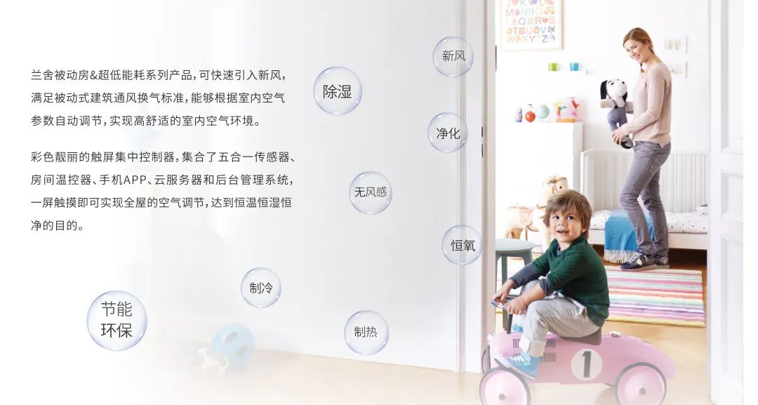 蘭舍被動(dòng)房&超低能耗系列產(chǎn)品,以綠色建筑、節(jié)能環(huán)保這兩方面作為突破點(diǎn),可快速引入新風(fēng),滿足被動(dòng)式建筑通風(fēng)換氣標(biāo)準(zhǔn),能夠根據(jù)室內(nèi)空氣參數(shù)自動(dòng)調(diào)節(jié),把智能科技浸潤(rùn)到新風(fēng)系統(tǒng)里,實(shí)現(xiàn)高舒適的室內(nèi)空氣環(huán)境。