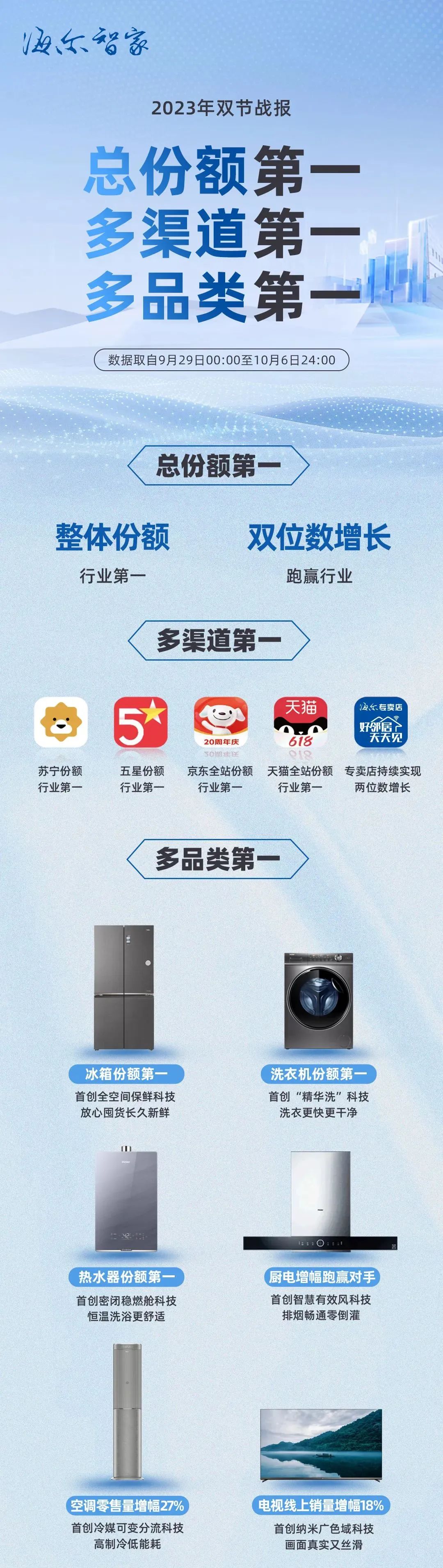 10月10日,海爾智家發(fā)布2023年中秋國慶雙節(jié)戰(zhàn)報,獲得三個維度第一。首先是總份額第一,整體份額行業(yè)第一,雙位數(shù)增長跑贏行業(yè);其次是多渠道第一,蘇寧、五星、京東、天貓份額均為行業(yè)第一,專賣店持續(xù)實現(xiàn)兩位數(shù)增長;最后是多品類第一,冰箱、洗衣機、熱水器等品類份額第一。