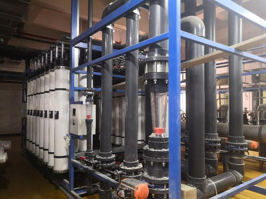該光伏企業(yè)坐落于江蘇省鹽城市亭湖區(qū),其企業(yè)建設(shè)的純水項(xiàng)目分為兩期,目前一期、二期純水項(xiàng)目均已投產(chǎn)。項(xiàng)目主要工藝為超濾+反滲透的“雙膜法”工藝,兩期設(shè)計(jì)產(chǎn)水能力為20000 t/d,原水為市政自來水。我司提供的超濾膜主要作為RO的前端預(yù)處理,以保證RO進(jìn)水滿足SDI15 < 3,濁度< 0.1 NTU的要求。