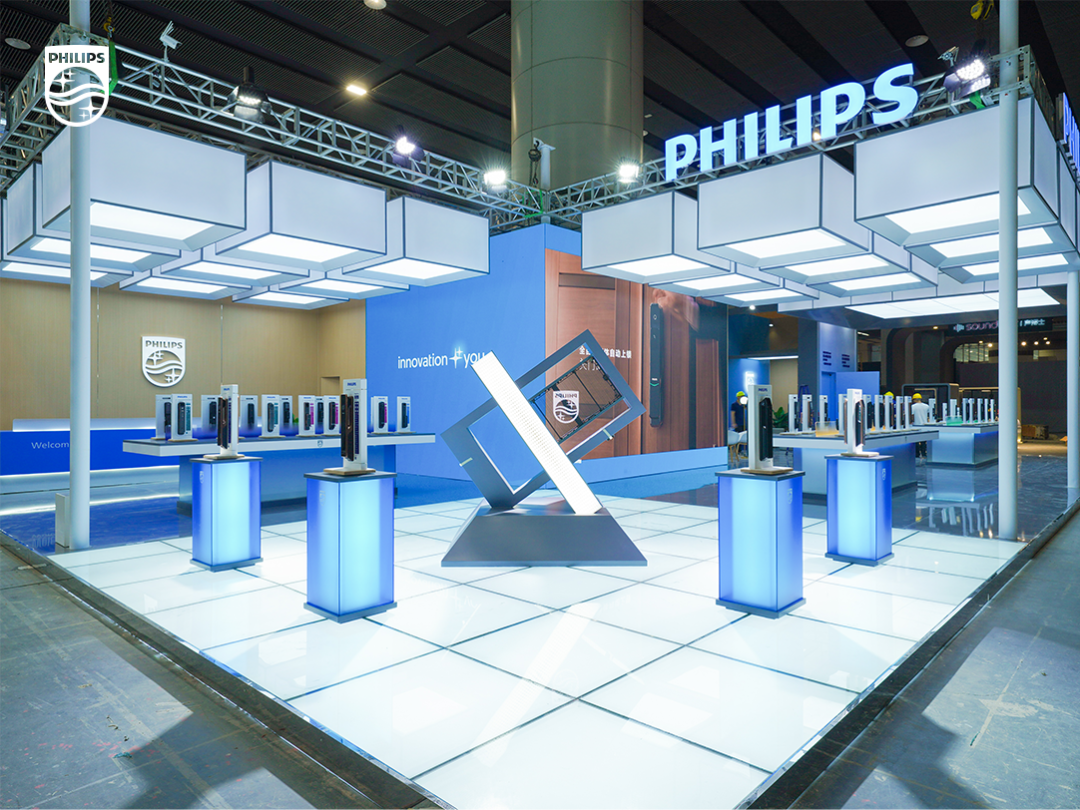 飛利浦智能鎖2023廣州建博會展館以“創(chuàng)域魔方,豈止一點”為概念,將獨特“魔方”建筑元素、品牌藍白主色調、簡約流暢線條完美融入整體展館,營造大而宏觀、亮而震撼的視覺觀感,打造沉浸式觀展體驗。