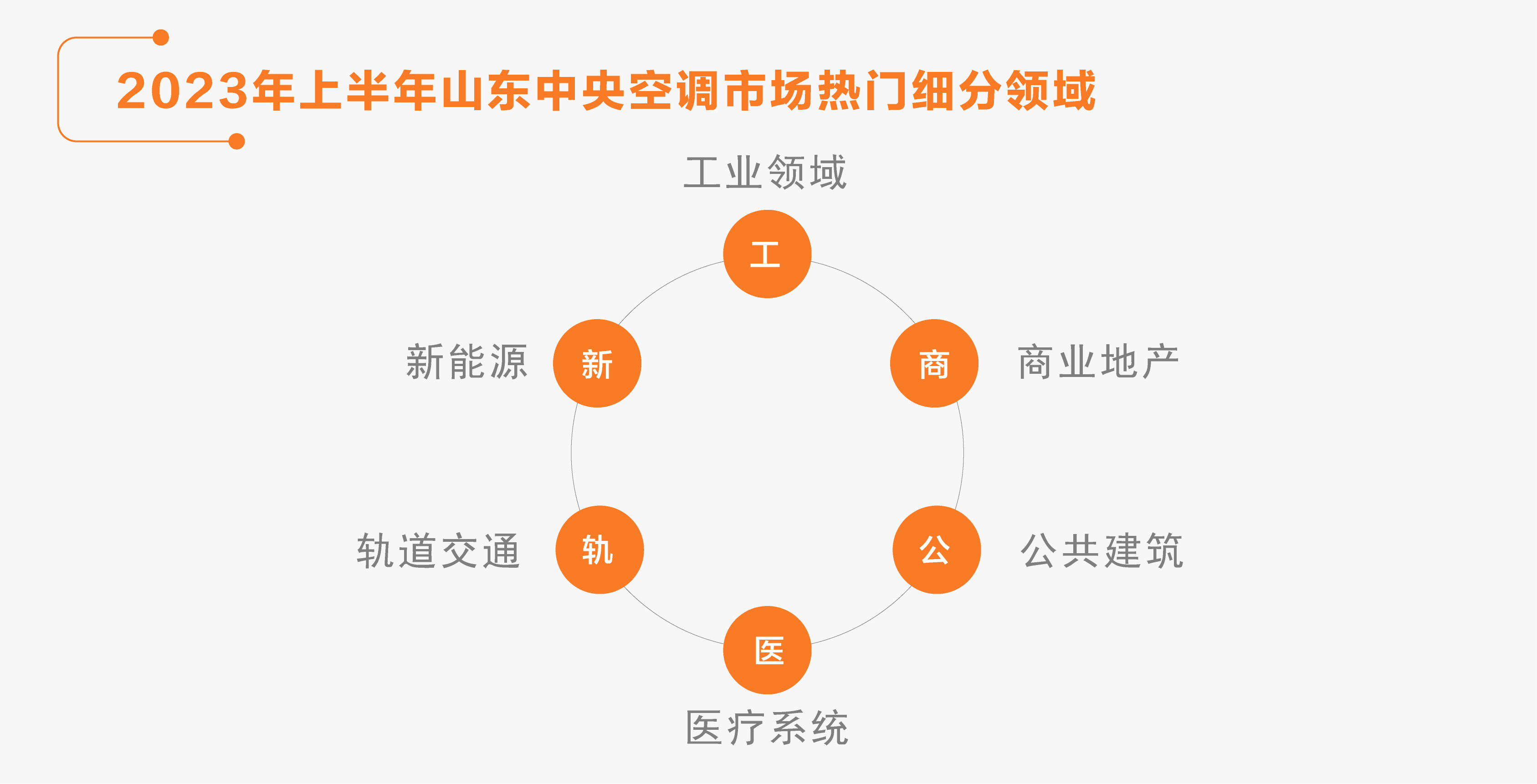 2023年上半年,山東中央空調(diào)工程市場(chǎng)上仍以工業(yè)領(lǐng)域、商業(yè)地產(chǎn)為主體項(xiàng)目領(lǐng)域,此外諸如醫(yī)療系統(tǒng)、軌道交通、新能源、鄉(xiāng)村振興等細(xì)分領(lǐng)域也在保持增長(zhǎng)態(tài)勢(shì)。但伴隨著中央空調(diào)行業(yè)“大眾市場(chǎng)”的擁擠與飽和,細(xì)分領(lǐng)域新機(jī)遇的探索將成為未來中央空調(diào)企業(yè)的重要發(fā)展方向。