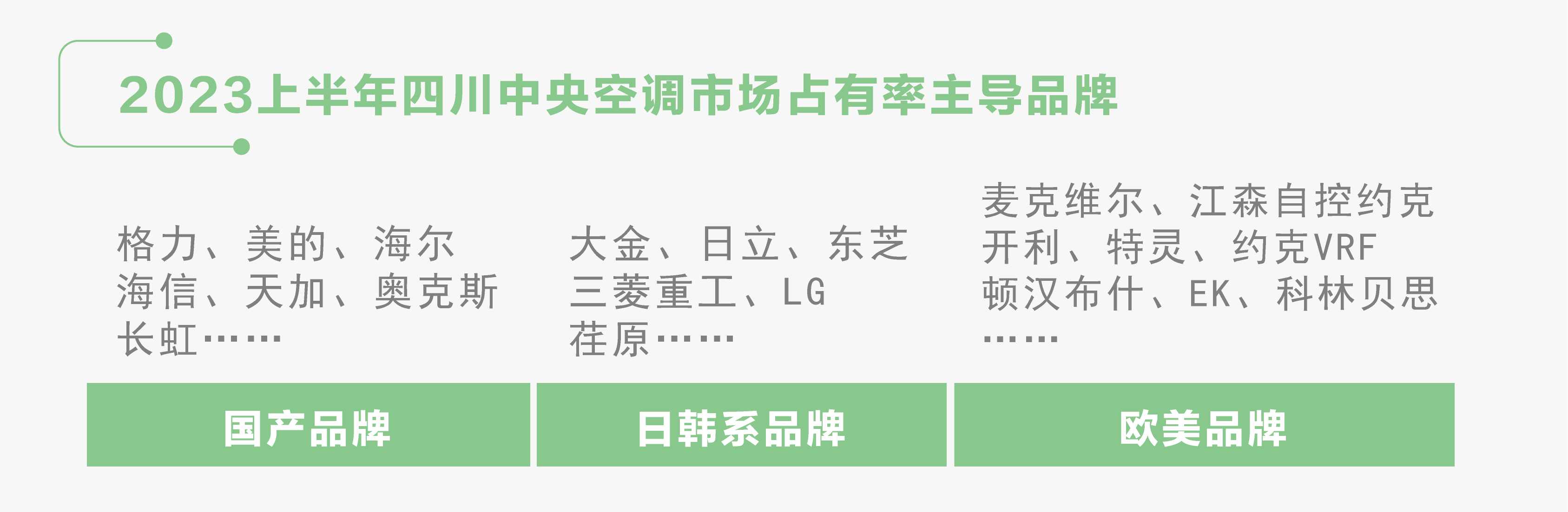 從品牌格局上看,國產(chǎn)品牌中,以格力、美的、海爾、海信、天加、奧克斯、長虹等為代表的品牌占據(jù)四川市場主要份額;日韓品牌,大金、日立、東芝、三菱重工、LG等保持了較為平穩(wěn)的增長;歐美系品牌,麥克維爾、江森自控約克、開利、特靈、約克VRF、頓漢布什、EK、科林貝思等品牌表現(xiàn)突出。