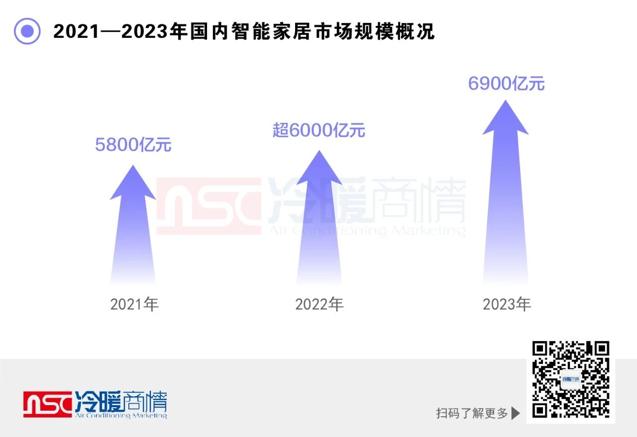 2023年,智能家居市場表現(xiàn)出穩(wěn)健的發(fā)展態(tài)勢。隨著人們對智能家居的認(rèn)識不斷提高,以及消費者對便捷、舒適和安全的家居環(huán)境的需求增加,智能家居市場的需求將會繼續(xù)增長。據(jù)冷暖商情不完全統(tǒng)計,2023年中國智能家居市場規(guī)模達(dá)6900億元。其中,智能家電、智能照明、智能安防等品類是市場需求最大的領(lǐng)域。