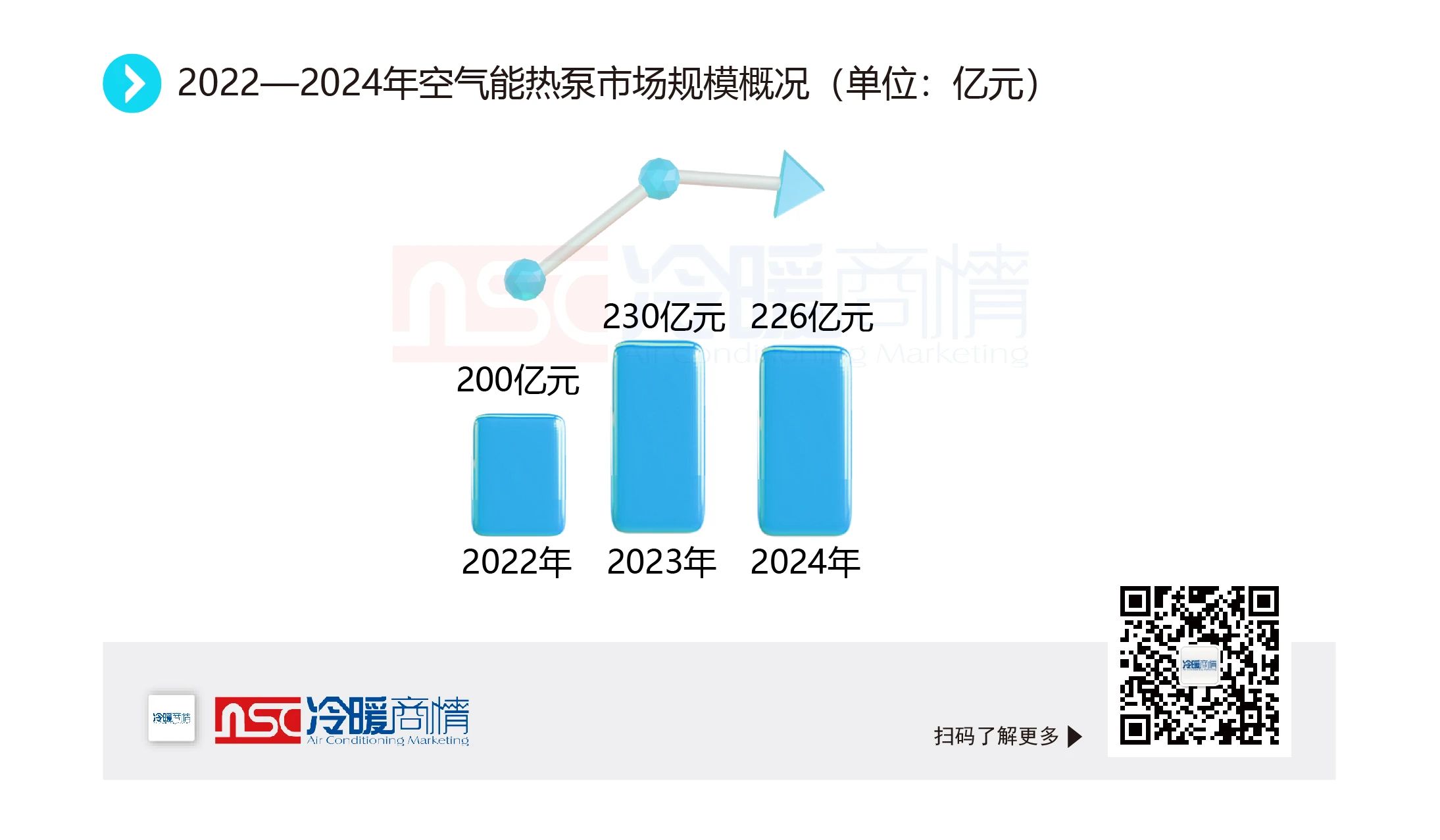 在政策與技術(shù)升級(jí)等多重因素影響下,2024年,空氣能熱泵市場(chǎng)總銷售額達(dá)到約226億元。這一數(shù)據(jù)表明,2024年中國(guó)空氣能熱泵市場(chǎng)在相對(duì)穩(wěn)定發(fā)展中有輕微下滑1.7%。