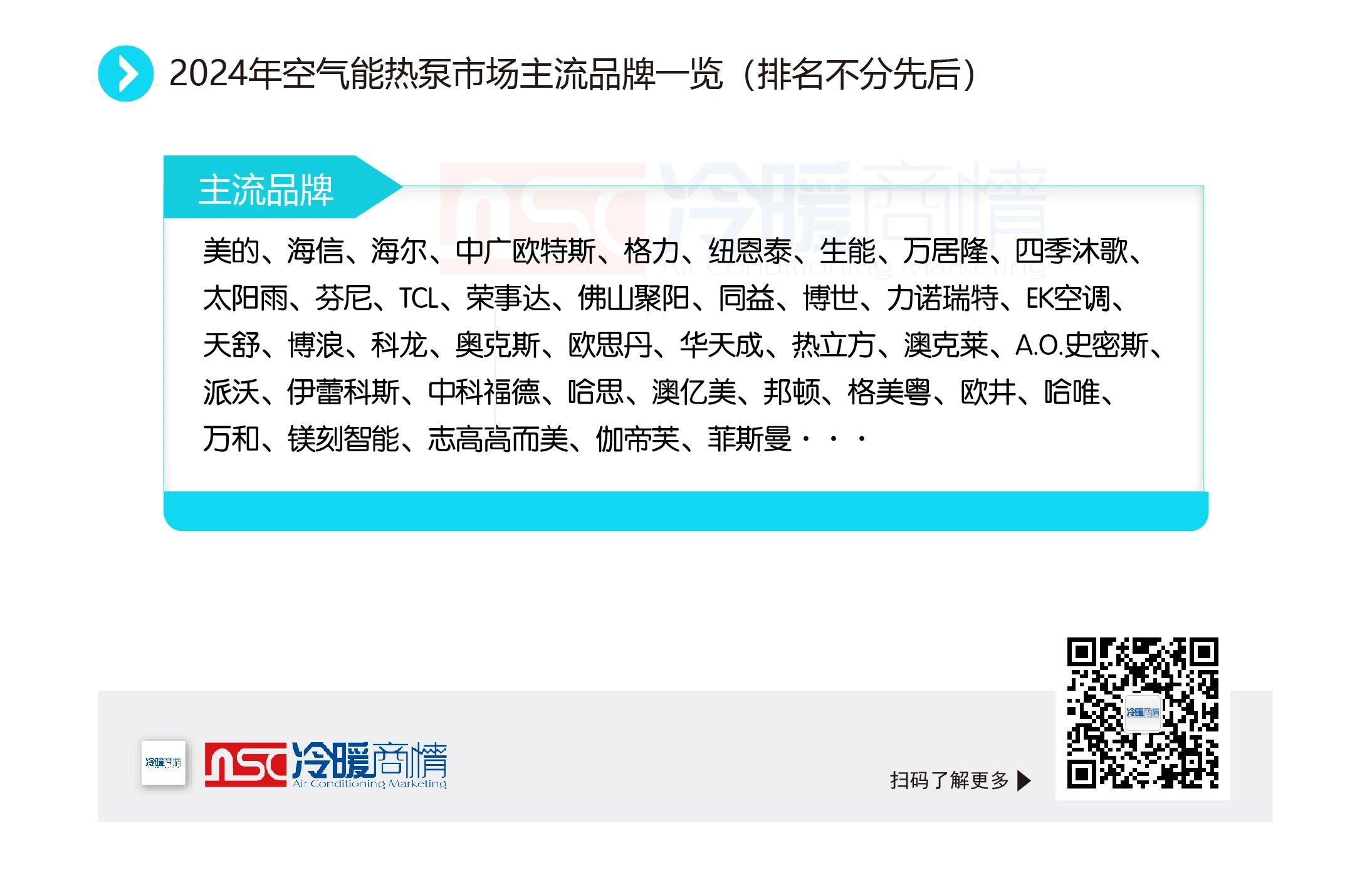 目前,中國(guó)的空氣能熱泵市場(chǎng)呈現(xiàn)出“百花齊放”的格局,眾多品牌競(jìng)爭(zhēng)激烈。其中,以美的、海信、海爾、格力等為代表的暖通空調(diào)品牌在市場(chǎng)上占據(jù)了主導(dǎo)地位。同時(shí),如中廣歐特斯、芬尼、紐恩泰、澳億美、博世、威能、熱立方、A.O.史密斯、四季沐歌、生能、歐思丹、同益、太陽(yáng)雨、萬(wàn)居隆等,通過(guò)自身不斷的積累及深耕在市場(chǎng)中占據(jù)一定的份額。