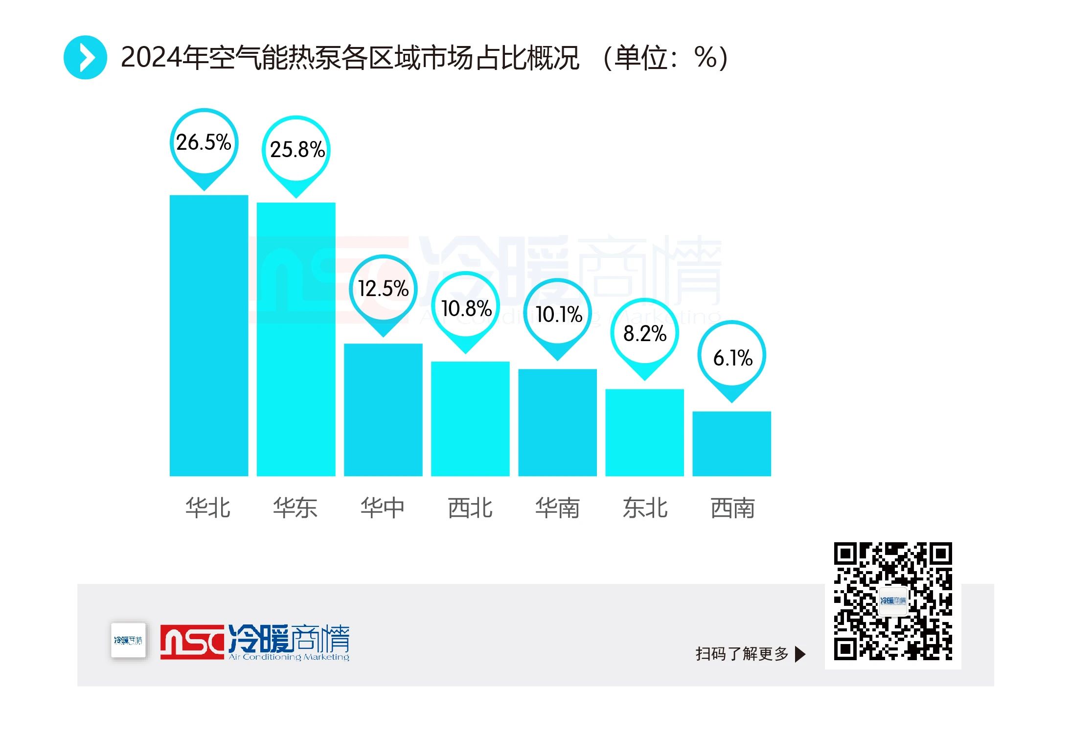 2024年我國(guó)空氣能熱泵在北方地區(qū)(華北、東北、西北)、華東市場(chǎng)表現(xiàn)突出,華南、華中、西南區(qū)域表現(xiàn)一般。